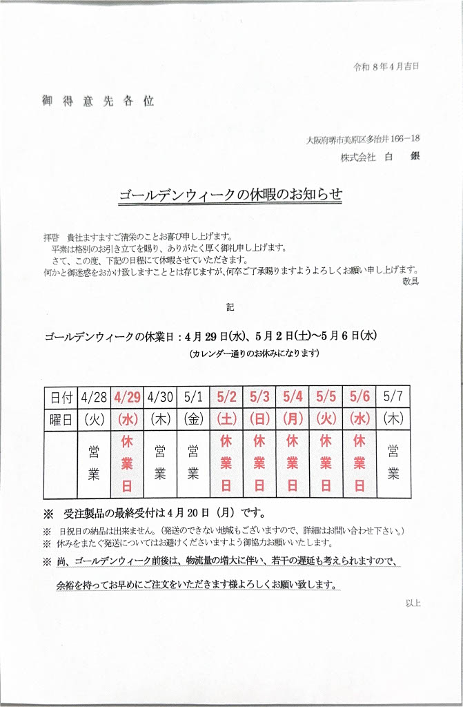 ゴールデンウィークのお休みのお知らせ